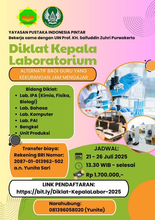 Dalam rangka meningkatkan kompetensi Kepala Laboratorium IPA (kimia, biologi, fisika), Lab. Bahasa, Lab. Komputer, Lab. PAI, Bengkel, dan Unit Produksi Sekolah/Madrasah se-Indonesia, Yayasan Pustaka Indonesia Pintar bekerja sama dengan UIN Prof. KH. Saifuddin Zuhri Purwokerto melaksanakan Diklat Kepala Laboratorium Tahun 2025 dengan Pola 120 JP pada tanggal 21 -26 Juli 2025 VIA Zoom.